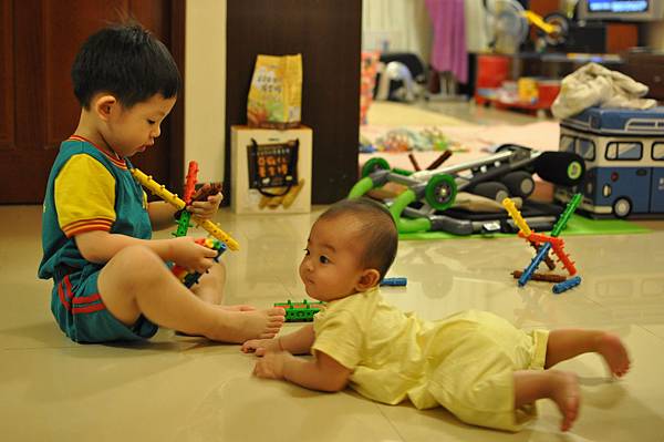 有時候睿霆會和沄蓁一起在地板爬行,也會開始拿玩具給MM玩,