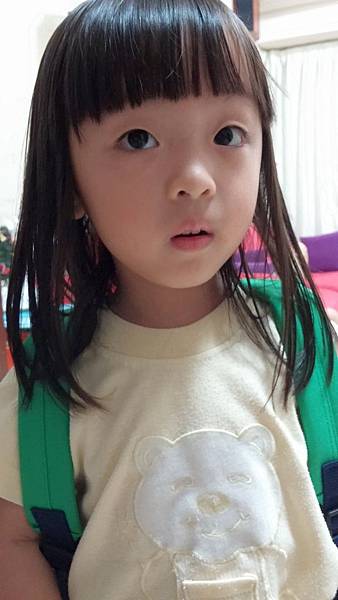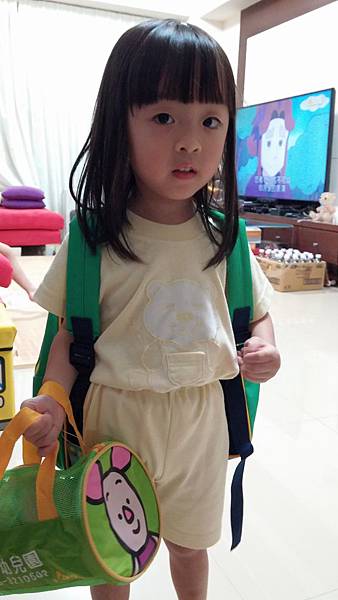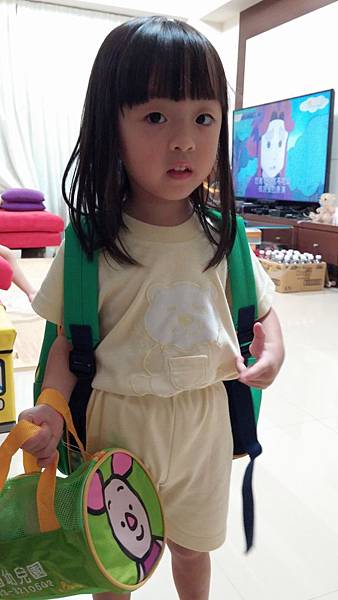 迫不及待的揹著書包,拿著餐袋,大聲的說要去上學了~