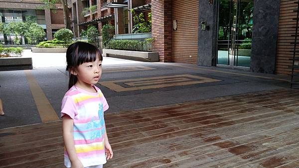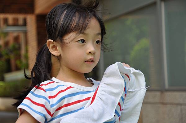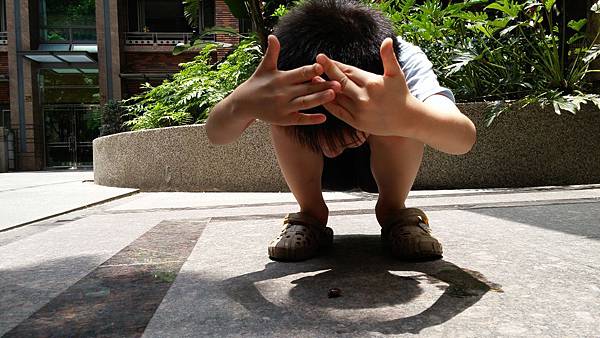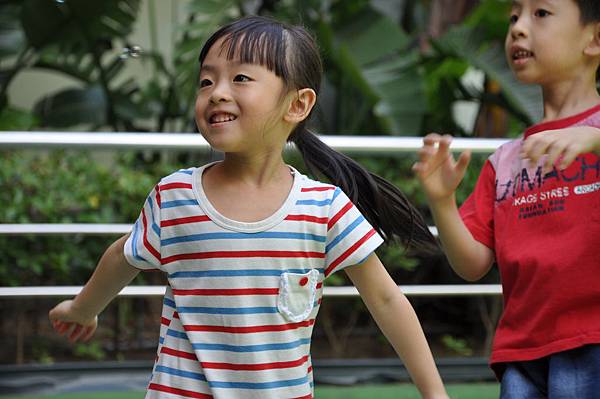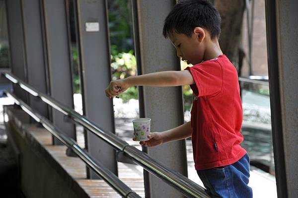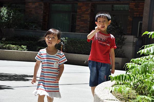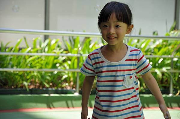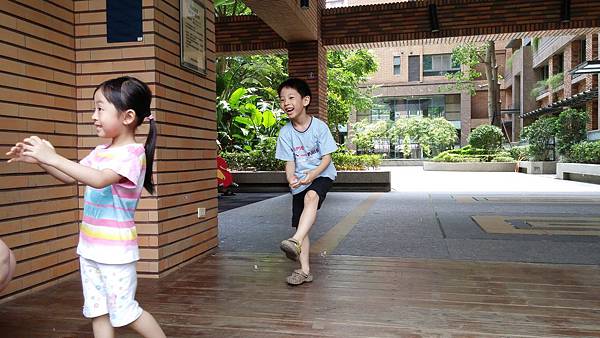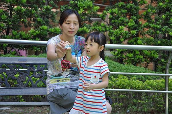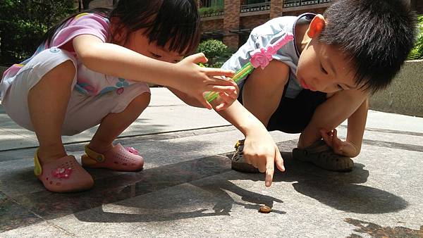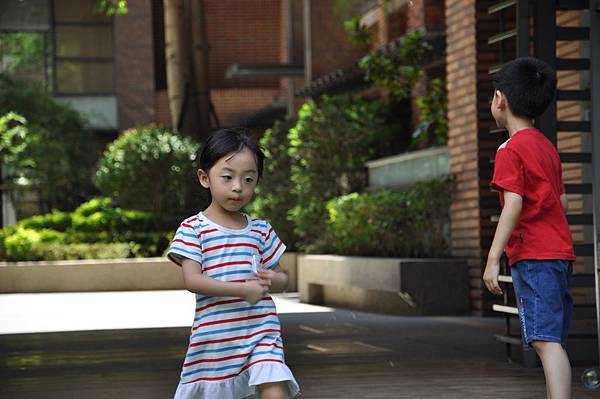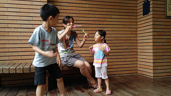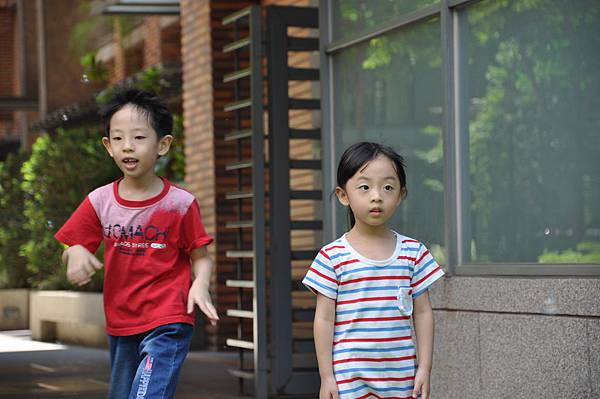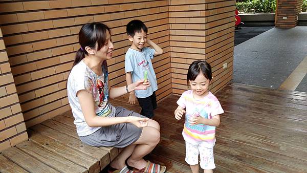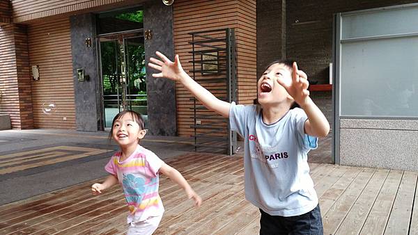 這個假日兩兄妹早上就到中庭吹泡泡.餵魚,
