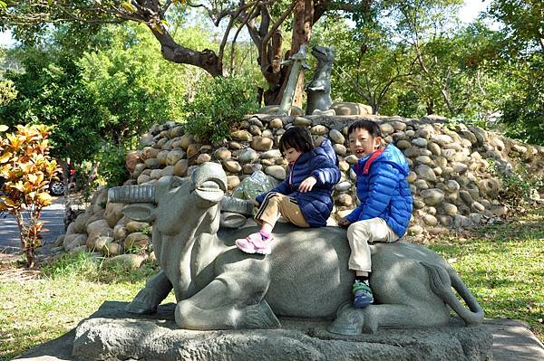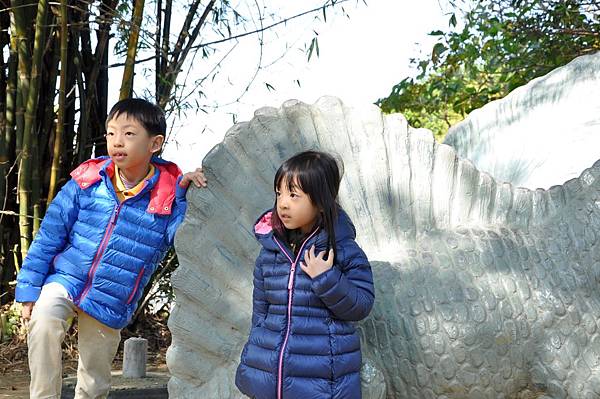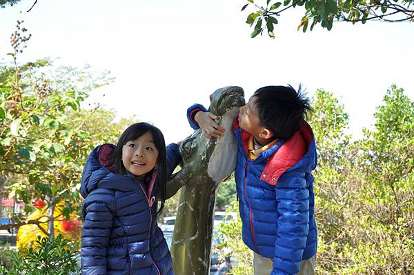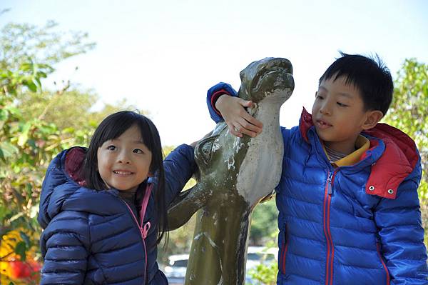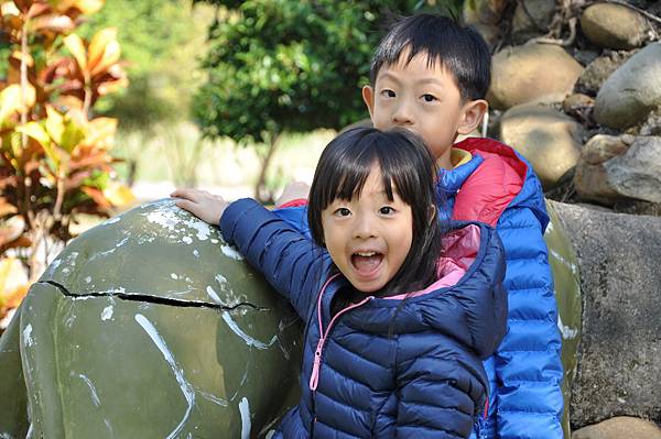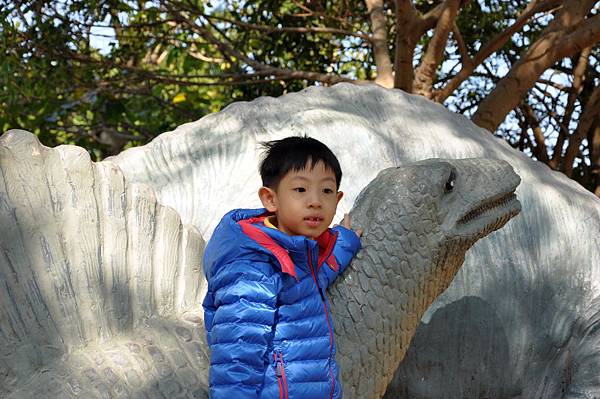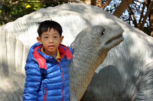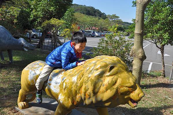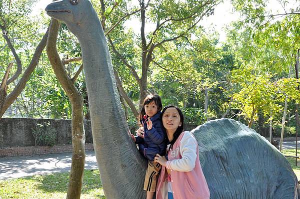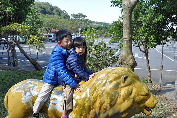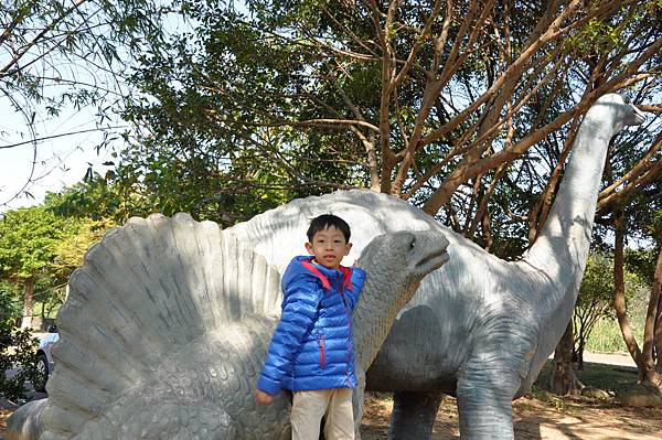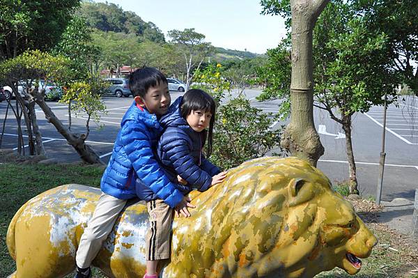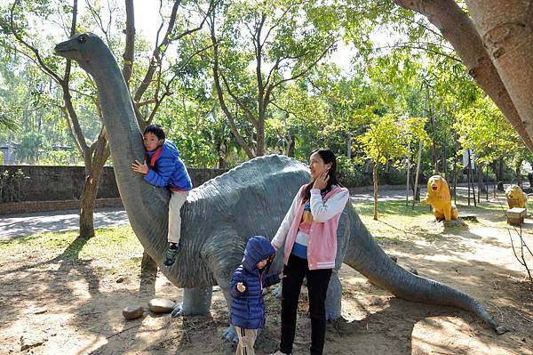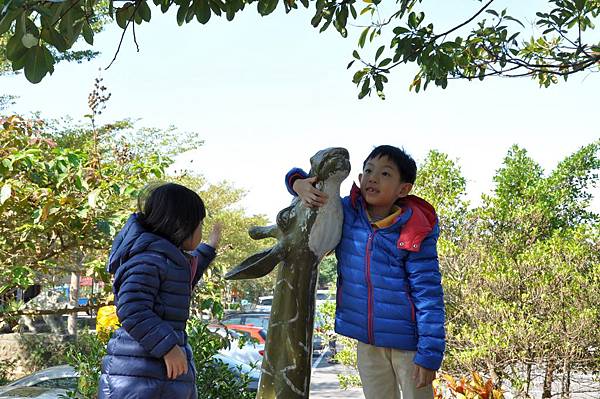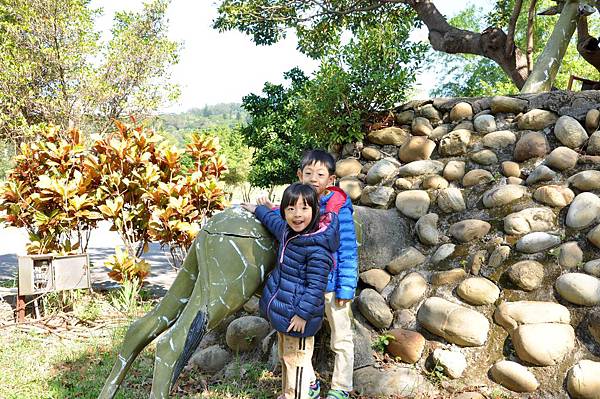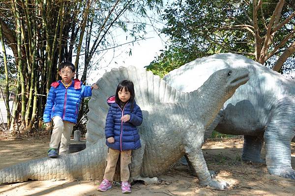 停車場旁的恐龍及動物就讓兩兄妹玩不停~